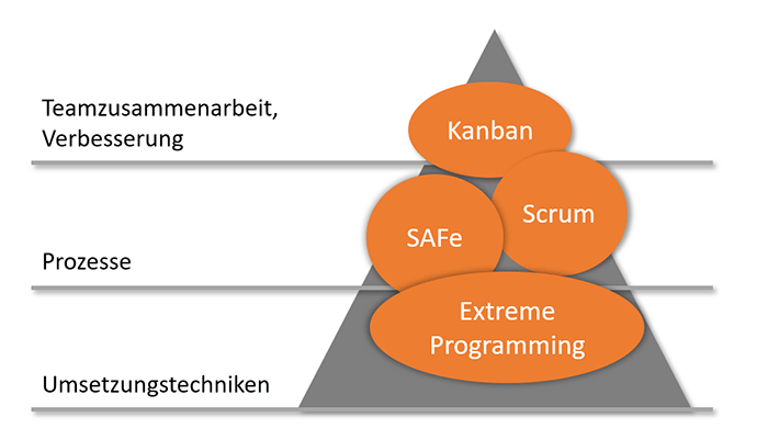 Die Landschaft agiler Ideen wirkt dabei oft wie ein Flickenteppich: So vielseitig wie die verschiedenen Methodenwerke Scrum, Kanban oder Extreme Programming – XP u.a. sind, so unterschiedlich arbeiten auch die Teams bei der Umsetzung.