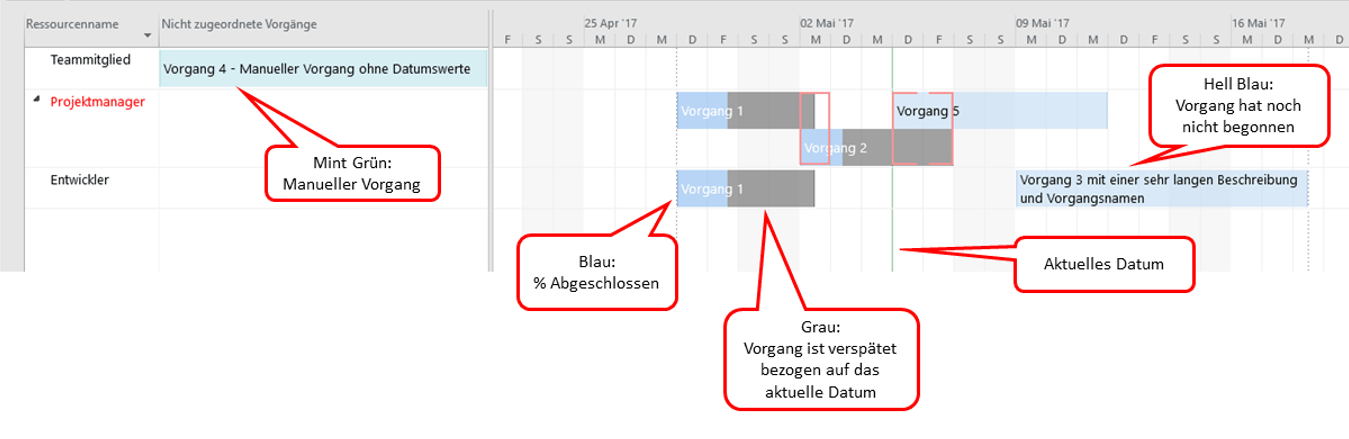 - Die Farbe Dunkelblau zeigt den bisherigen Vorgangsfortschritt und Grau verspätete Vorgänge