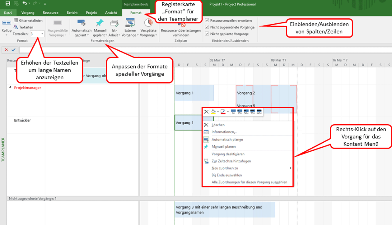 In der Ansicht Teamplaner klicken Sie im Menüband auf die Registerkarte Format. Hier finden Sie eine Reihe von Formatierungsmöglichkeiten nur für den Teamplaner, wie beispielsweise: