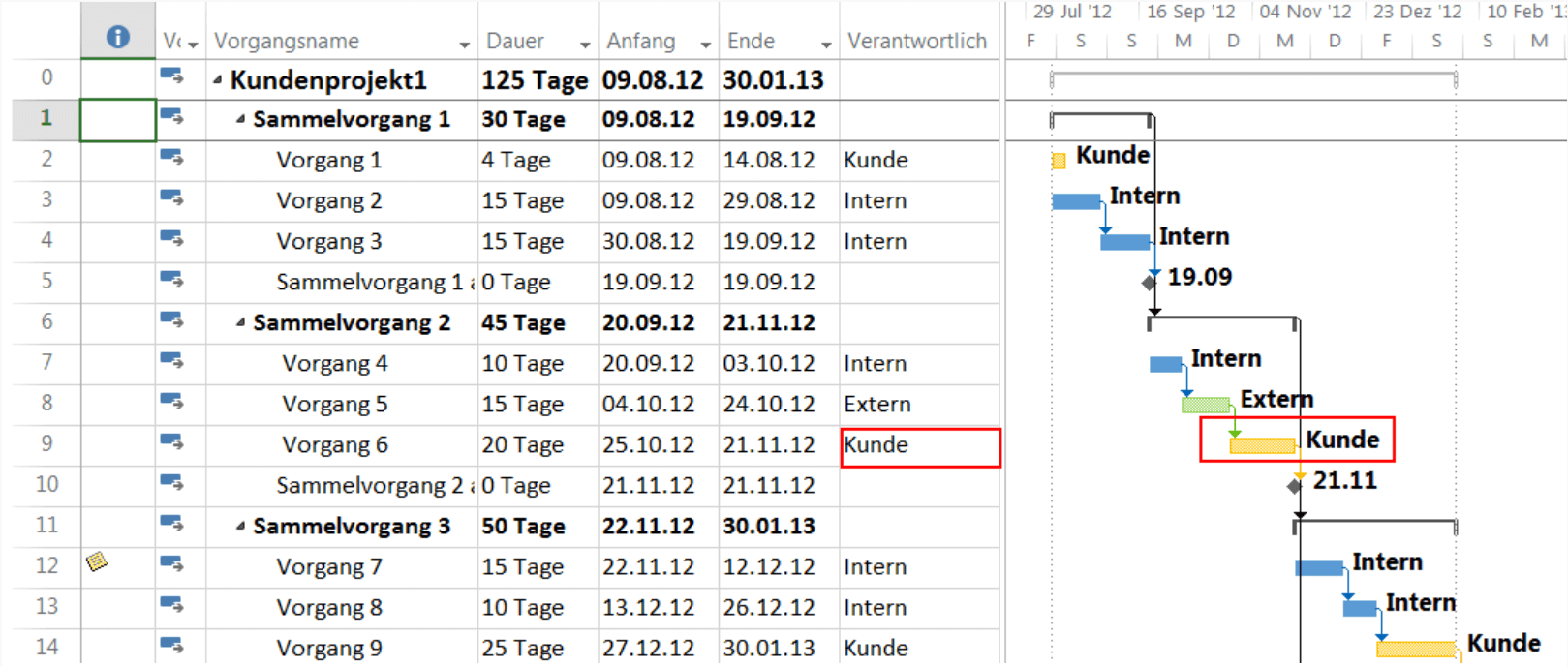 Tipp: Verwenden Sie die Taste F9, um nach einer Änderung des Verantwortlichen in Spalte „Verantwortlich“ die Zuordnung im Gantt Chart zu aktualisieren.