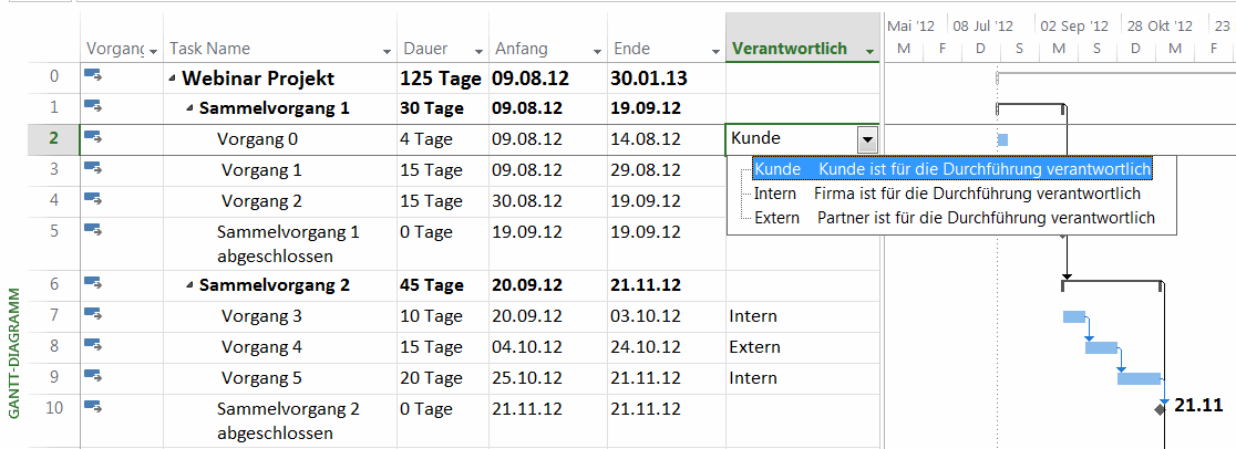 Das Ziel: Vorgänge in Ihrem Projekt werden von drei unterschiedlichen Verantwortlichen durchgeführt – „intern“, „extern“, „Kunde“. Für Ihre Meetings wünschen Sie sich, die Unterschiede visuell schnell erkennen zu können. Ihr Ziel ist, eine grafisch differenzierte Darstellung mit der Spalte „Verantwortlich“ zu erhalten (sihe folgendes Bild).