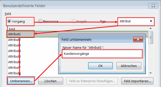 Wählen Sie ein Feld Vorgang mit Typ Attribut aus. Selektieren Sie ein noch nicht belegtes Attributfeld z.B. Attribut1 und klicken Sie auf Umbenennen. Nennen Sie das Feld in „Kundenvorgänge“ um und bestätigen Sie die Änderung mit OK.