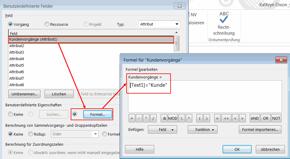 Als nächsten Schritt geben Sie eine Formel ein, die feststellt, ob das Textfeld „Verantwortlich“ eines Vorgangs den Begriff „Kunde“ enthält.