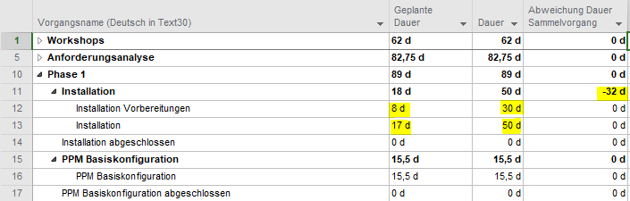 Ziel: Wir möchten die Abweichung der Dauer eines Vorgangs im Vergleich zum Basisplan berechnen – allerdings nur für Vorgänge vom Typ Sammelvorgang.
