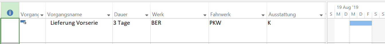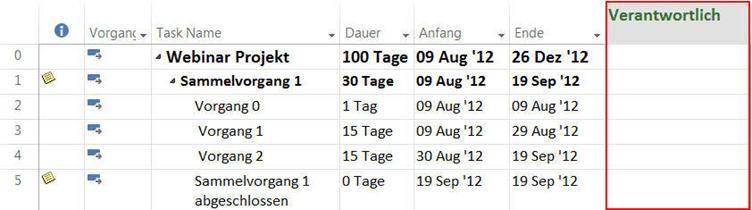 Zu guter Letzt fügen Sie die neue Spalte optimalerweise gemeinsam mit den Feldern Dauer und Geplante Dauer in Ihre Vorgangstabelle ein.