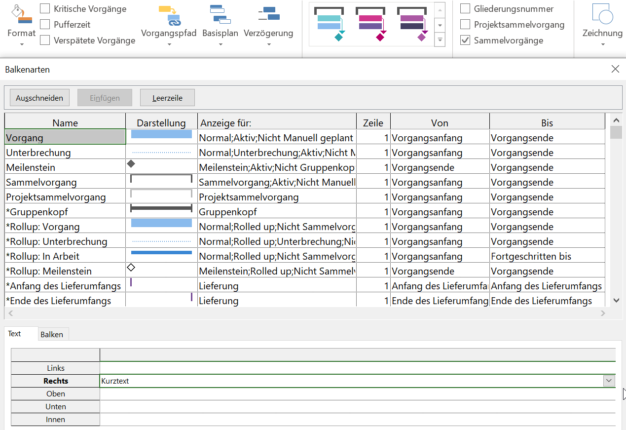 Sie können sich den direkt übergeordneten Sammelvorgang über die Spalte „Sammelvorgangsname“ anzeigen lassen. Diese Information können Sie im Gantt-Diagramm anzeigen, indem SIe mit der rechten Maustaste in das Gantt-Diagramm klicken und die Schaltfläche „Balkenarten“ aktivieren. Wechseln Sie hier in die Registerkarte „Text“. Hier können Sie auswählen, ob die Information Links, Rechts, Mittig etc. angezeigt werden soll.