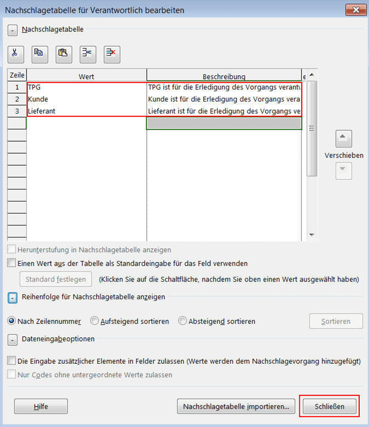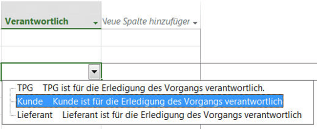Jetzt geben Sie die Verantwortlichen je Vorgang ein. In unserem Fallbeispiel sind es TPG, Kunde und Lieferant.