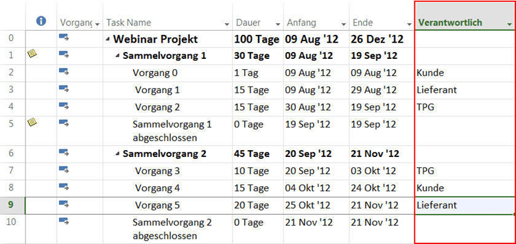 Da Sie allerdings nur den direkt übergeordneten Sammelvorgang anzeigen können, wird es bei weiteren Gliederungsebenen innerhalb der Projekte komplizierter. Hier könnte möglicherweise ein benutzerdefiniertes VBA Makro helfen.