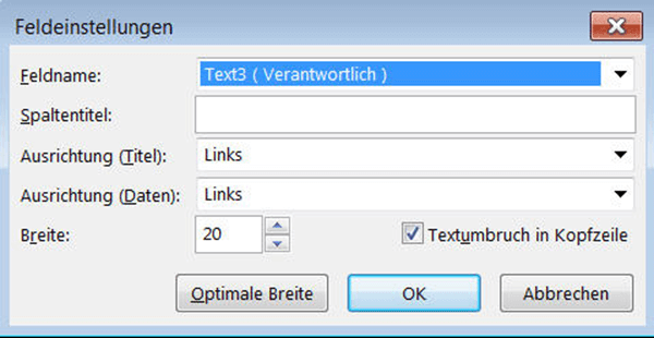 Falls notwendig können die Einstellungen einer vorhandenen Spalte angepasst werden. Wählen Sie dazu Feldeinstellungen im Kontextmenü mit der rechten Maustaste aus.