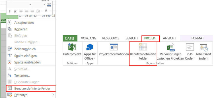 Wählen Sie Benutzerdefinierte Felder im Kontextmenü eines beliebigen Spaltenamen mit der rechten Maustaste aus, z.B. in der Tabelle Eingabe. Oder klicken Sie auf Benutzerdefinierte Felder im Menüband Projekt.