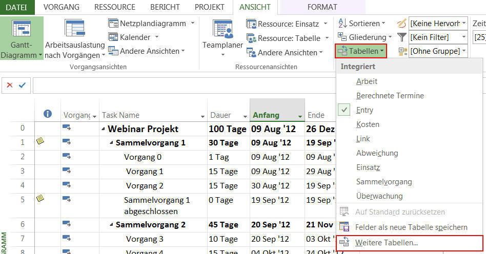 Im Menüband Ansicht wählen Sie Weitere Tabellen… im Menü Tabellen aus.