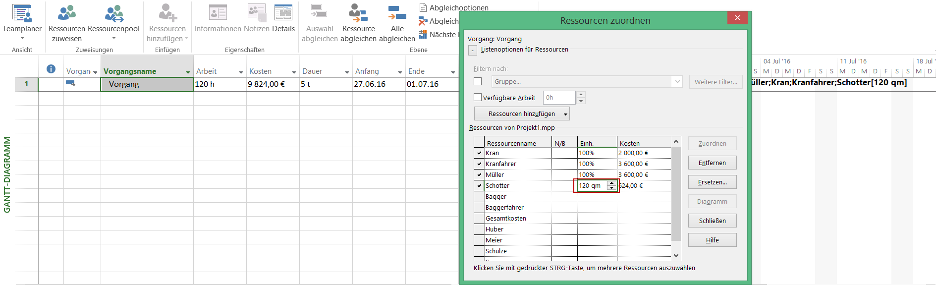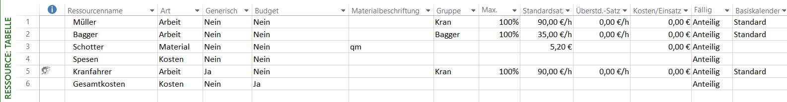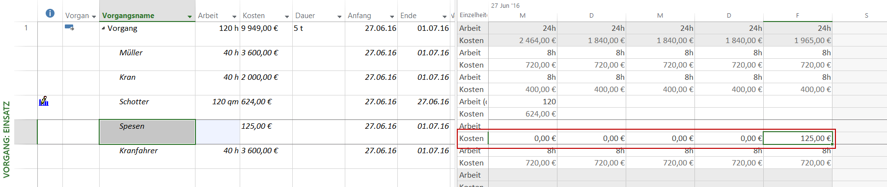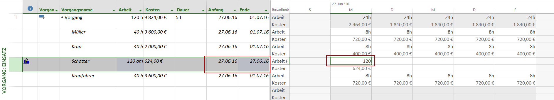In der letzten Grafik arbeitet die Ressource Müller zu einem Stundensatz von 95 € von Montag bis Freitag 8 Stunden pro Tag auf dem Vorgang. Zudem ist ein weiterer Kranführer mit dem gleichen Stundensatz für diese Tätigkeit vorgesehen, der noch nicht namentlich bekannt ist.