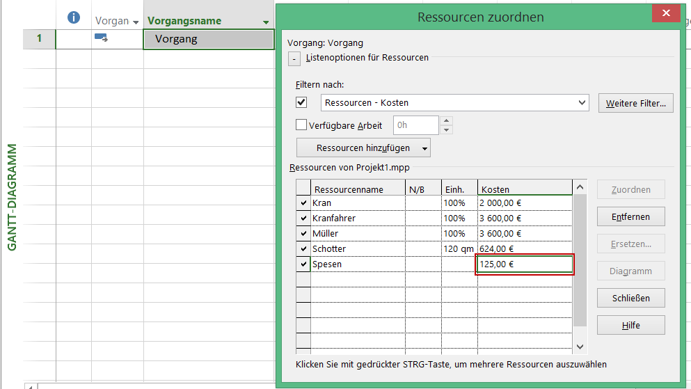 Echte Kosten werden wie Arbeitsressourcen dem Vorgang zugeordnet. Nur ist hier nicht die Eingabe von Arbeit oder Einheiten erforderlich. Die Kosten eines Vorgangs werden direkt eingegeben.