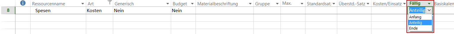 Für Kostenressourcen können Sie auch eine allgemeine Fälligkeit definieren. Diese wird dann als Standard bei jeder Zuweisung angewendet. Wählen Sie dazu in der Ansicht Ressource: Tabelle die erforderliche Fälligkeit für die Kostenressource aus.
