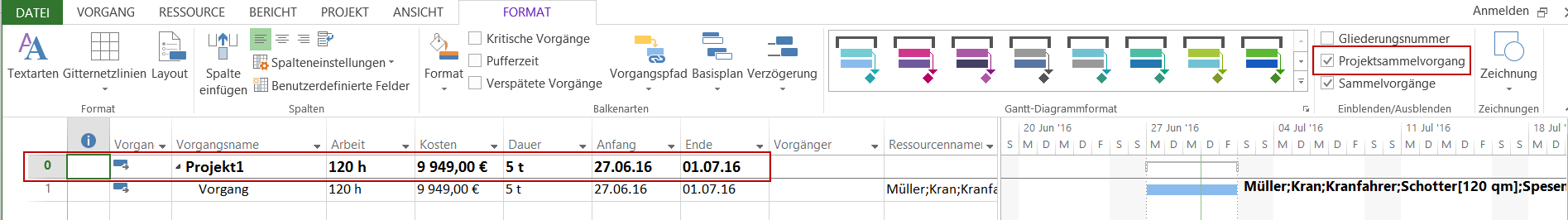 Damit der Projektsammelvorgang angezeigt wird, müssen Sie in einer Vorgangstabelle das Kontrollkästchen Projektsammelvorgang auf der Registerkarte Format aktivieren. Wenn es aktiviert ist, wird der Projektsammelvorgang in Zeile 0 angezeigt.