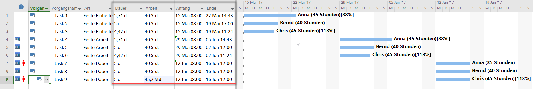 - Bei den Vorgängen Task 2 und 5 (Zeile 2 und 5), denen Bernd mit 100% zugewiesen wurde, sind alle so geblieben, wie vorgegeben. Bernd arbeitet 8 Stunden pro Tag, also kann er das Arbeitsvolumen von 40 Stunden in 5 Tagen bewältigen.