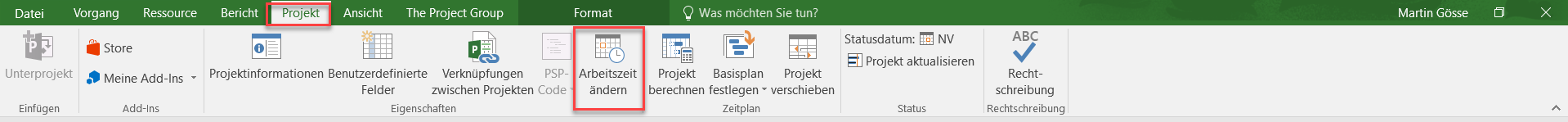 Die Einstellung des Kalenders können Sie sich anzeigen lassen, indem Sie im Reiter Projekt die Schaltfläche Arbeitszeit ändern anklicken.