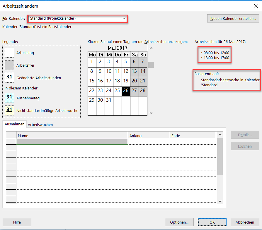 - MS Project Kalender Standardwerte