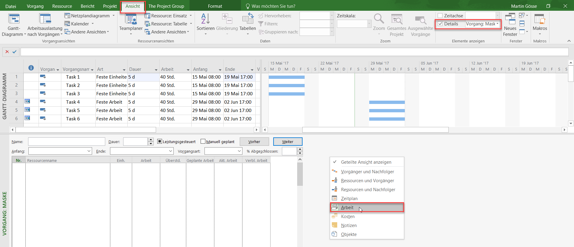 Unser Tipp: Wenn Sie mit Ressourcen arbeiten, empfehle ich Ihnen eine geteilte Ansicht. Im oberen Teil der Ansicht lassen Sie das Gantt-Chart stehen, im unteren Teil wählen Sie Vorgang: Maske Arbeit aus.