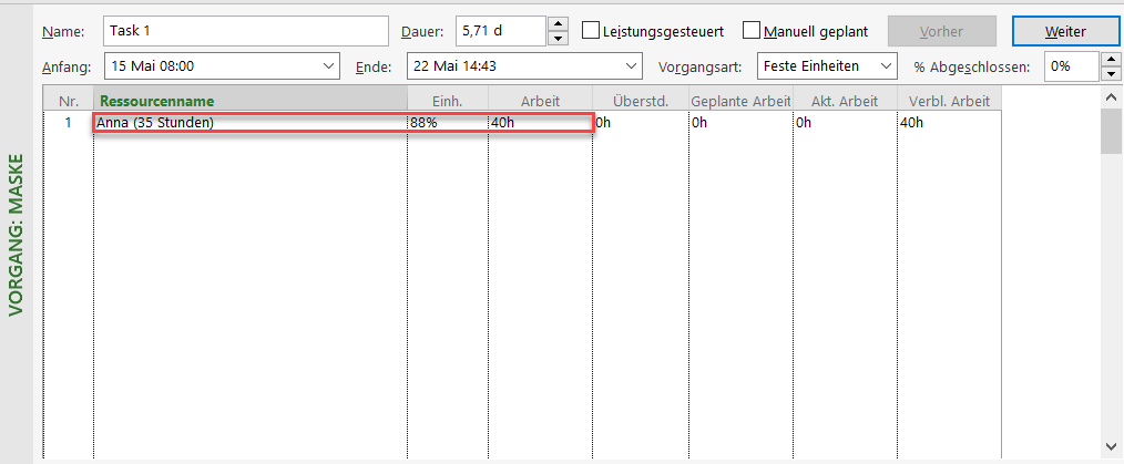 - Bei den Vorgängen Task 1 und 4 (Zeile 1 und 4), denen Anna mit ihren 88% zugewiesen wurde, sieht das Ergebnis wie folgt aus: Bei Task 1 und 4 (Feste Einheiten, Feste Arbeit) wurden die Vorgangsdauern auf 5,71 Tage erhöht und die Vorgänge enden später. Das liegt daran, dass Anna pro Tag nur 7 Stunden arbeitet (verfügbar ist). Folglich benötigt sie für die Abarbeitung des Arbeitsvolumens von 40 Stunden mehr Zeit.