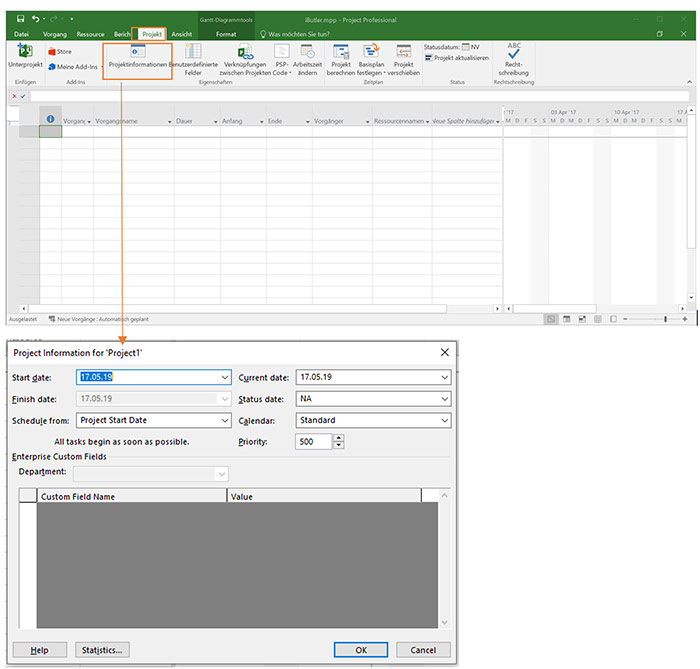 Nachdem Sie Ihr Projekt erstellt haben starten Sie mit Schritt 1 unseres MS Project Tutorials – mit der Eingabe des Anfangstermins. Das ist besonders wichtig, da MS Project standardmäßig den Anfang aller neu erstellten Vorgänge auf das Projektstartdatum setzt. Das heißt konkret: Die Berechnung des gesamten Projektes basiert auf dem Projektanfangstermin.