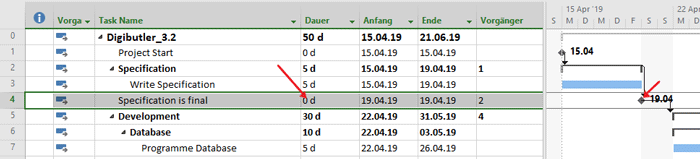 Bei der Eingabe der Dauer von Vorgängen können Sie übrigens auch Meilensteine definieren. Ein Vorgang wird automatisch zu einem Meilenstein, wenn Sie die Dauer 0 eingeben. Meilensteine definieren die wichtigsten Eckpfeiler in Ihrem Projekt und werden üblicherweise jeweils am Ende einer Phase platziert.