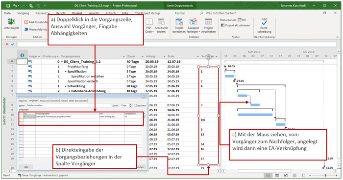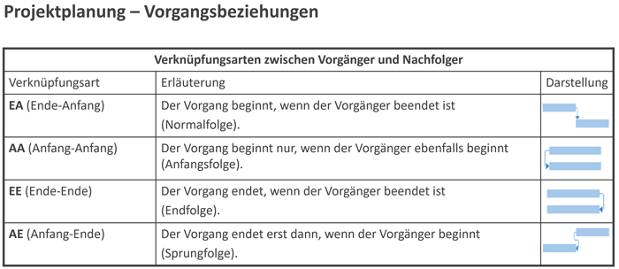 Das heißt, es geht dabei um eine sequenzielle Abfolge der Vorgänge. Hier kommen sogenannte Ende-Anfang-Beziehungen ins Spiel.