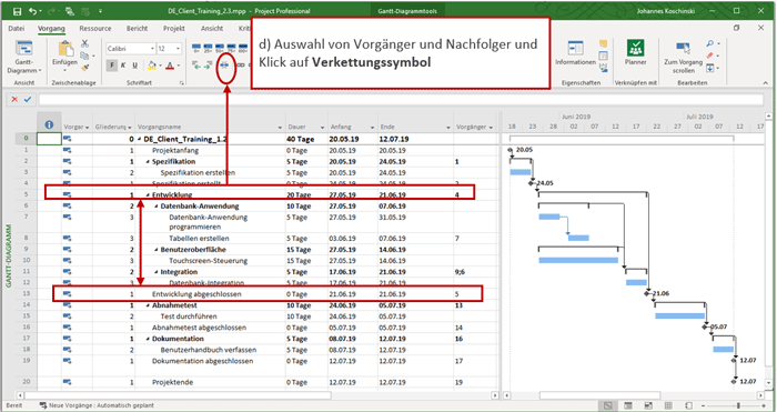 - Auswahl der Vorgänger und Nachfolger über Verkettungssymbol: Bei dieser Methode wählen Sie zwei Vorgänge aus und klicken auf das Verkettungssymbol in der Registerkarte Vorgang.