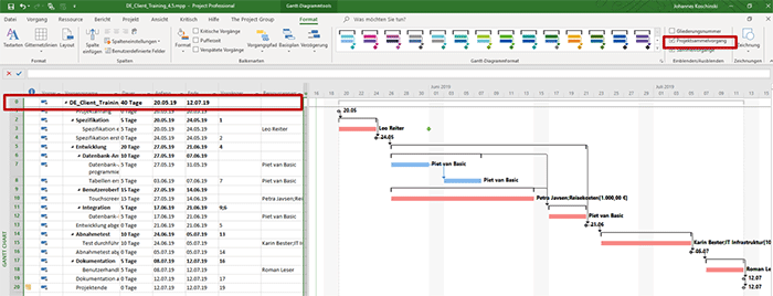 Dieser wird nach dem Einblenden in der Zeile 0 angezeigt und gibt wichtige Informationen wie Anfang, Ende, Arbeit, Dauer und Kosten für das Gesamtprojekt.