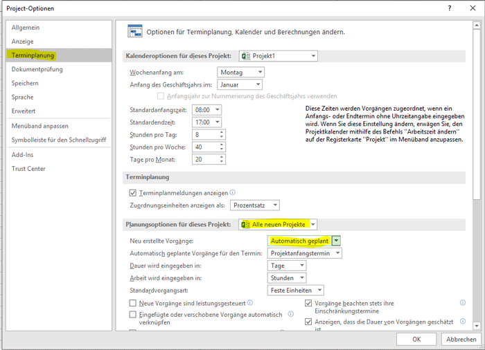 Wählen Sie im Bereich Planungsoptionen für dieses Projekt im Dropdown Alle neuen Projekte. Anschließend können Sie unter Neu erstellte Vorgänge den gewünschten Planungsmodus auswählen.