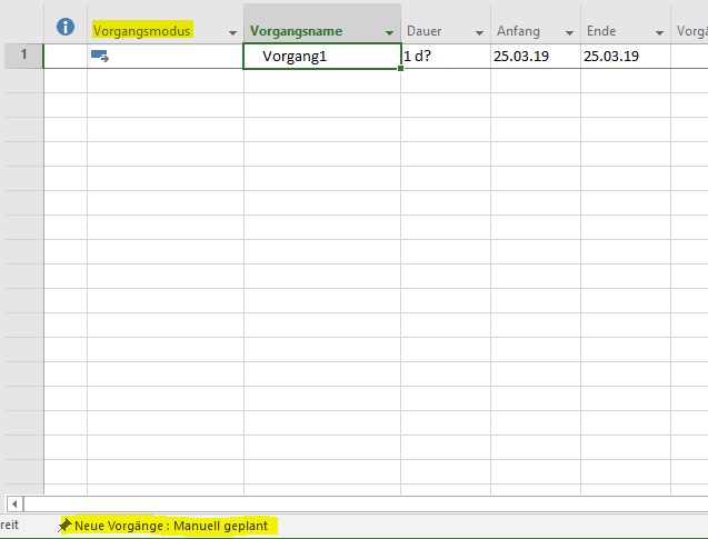 Außerdem können Sie unterhalb der Eingabetabelle Ihres Projektplans den Modus für ein einzelnes Projekt ändern. Oder Sie passen den Vorgangsmodus einzelner Vorgänge über die Spalte Vorgangsmodus an.