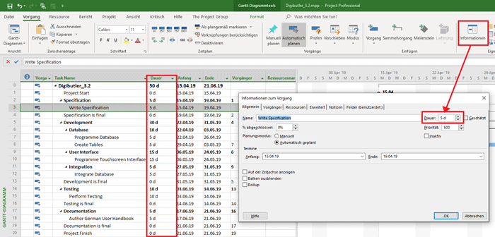 Schritt 5: Vorgangsdauern und Meilensteine eingeben