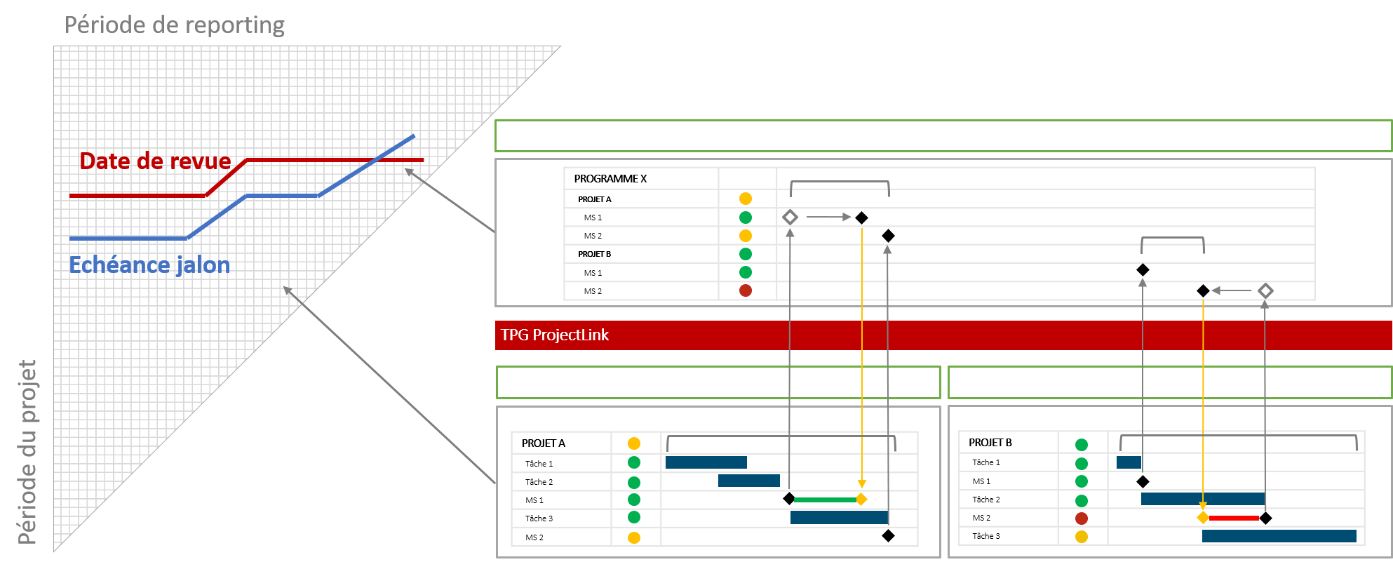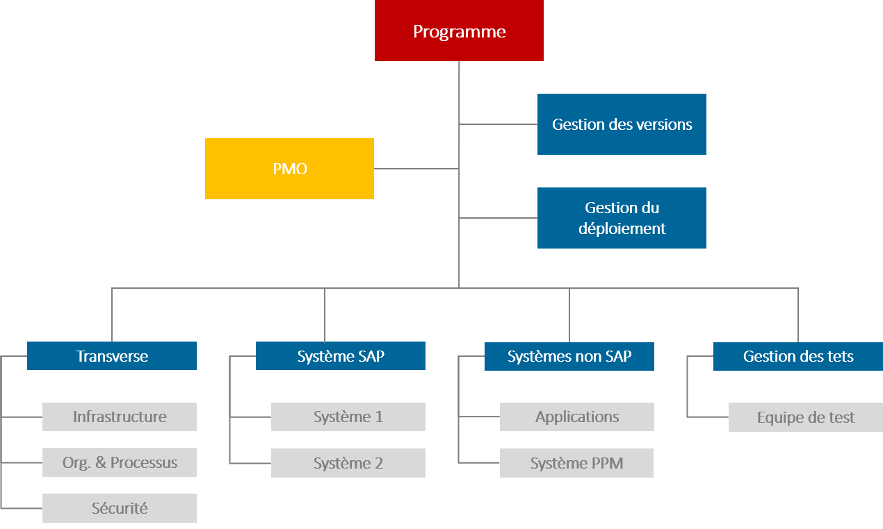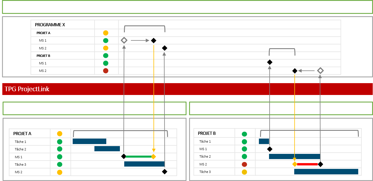 Nous vous conseillons aussi de créer un projet master séparé pour le programme. Ce plan de programme doit contenir toutes les informations de contrôle. Toutes les interfaces ou livraisons partielles doivent converger et être contrôlées à partir de ce plan.