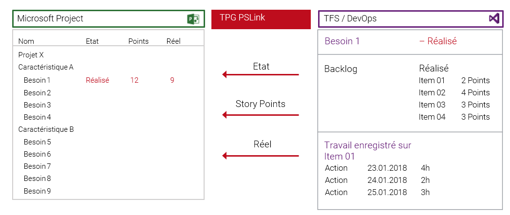 Note : Les études de cas présentées ici ne peuvent être réalisées qu’avec Microsoft Project Server ou Project Online (PPM). De plus, les études de cas utilisent le produit d’interface TPG PSLink. Cela permet la réalisation de plusieurs scénarios. Dans ces scénarios, l’utilisateur provoque l’échange de données ou alors des travaux automatisés sont exécutés en arrière-plan.