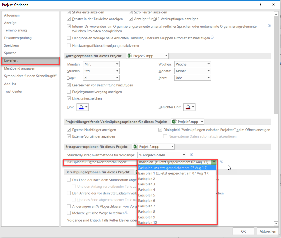 Wählen Sie den Eintrag Erweitert und scrollen Sie zu dem Bereich Ertragswertoptionen für dieses Projekt. Hier finden Sie die Option „Basisplan für Ertragswertberechnungen“. Sie können festlegen, welcher Basisplan für die Abweichungsberechnung verwendet werden soll. Der Standardwert für die Berechnung ist der Basisplan.