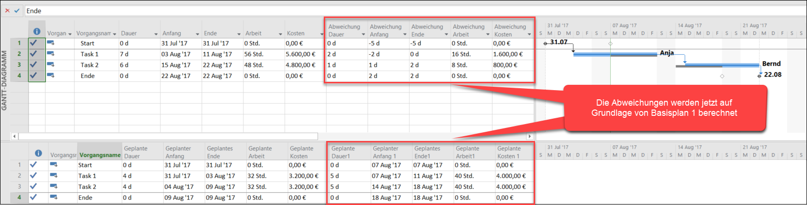 Die in Bild 3 angezeigten Abweichungen entsprechen exakt denen in Bild 2. Die Abweichungen werden also weiterhin in Bezug auf die geplanten Werte des Basisplans berechnet.