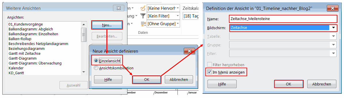 Bei der Ansichtsdefinition geben Sie Ihrer neuen Timeline einen passenden Namen. Wählen Sie als Bildschirm-Vorlage Zeitachse aus dem Menü aus und selektieren Sie ImMenü anzeigen. Bestätigen Sie nun Ihre Auswahl mit OK und schließen Sie das Dialogfenster Weitere Ansichten…ohne die neue Ansicht auszuwählen.