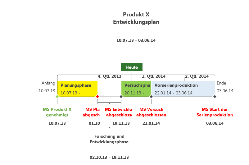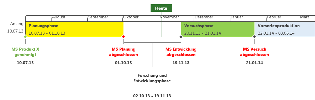 Bild 1: Formatierte Zeitachse mit Phasen, Meilensteinen und ausgewählten Vorgängen