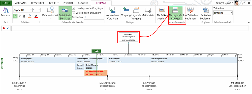 Hinweis: Vorgänge oder Sammelvorgänge können auf ähnlicher Art als Legende anzeigt werden. Falls die Legenden oder Meilensteintexte übereinander liegen, selektieren Sie eine Legende und bewegen Sie diese mit gehaltener linker Maustaste an eine passende Stelle (siehe Meilenstein vom 03.06.2013 in Bild 5).