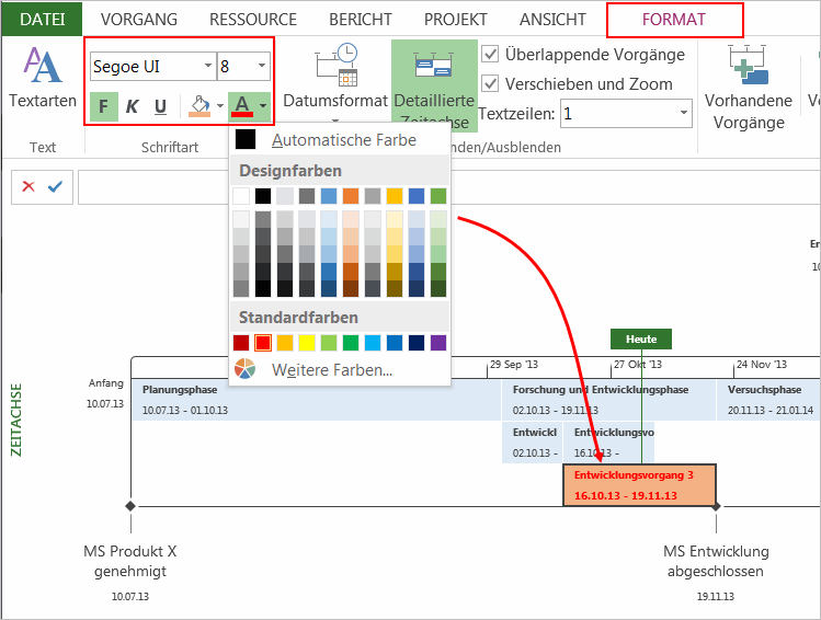Es gibt mehrere Möglichkeiten zur MS Project Zeitachsen-Formatierung. Wichtig ist, dass Sie vorher, wie oben beschrieben, die speziellen Formatierungsfunktionen für die Zeitachse aktiviert haben. Wir zeigen Ihnen hier nur ein paar Möglichkeiten.