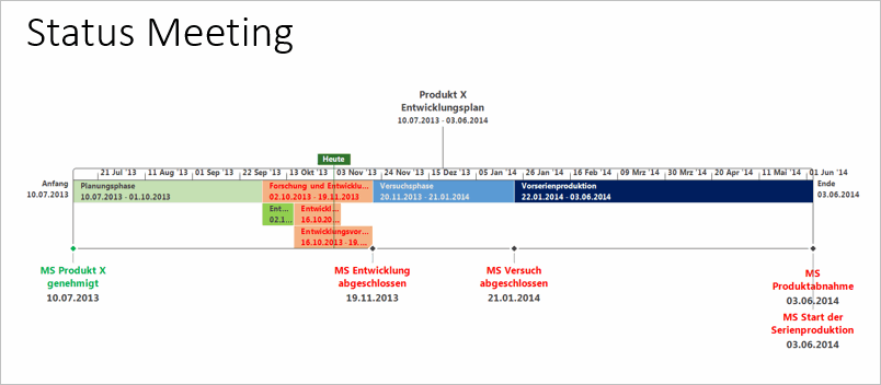 In unserem Beispiel oben haben wir bereits folgende Zeitachse mit den Hauptprojektphasen für ein Team-Meeting erstellt.