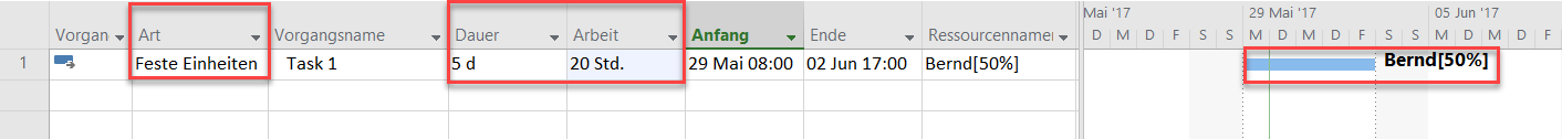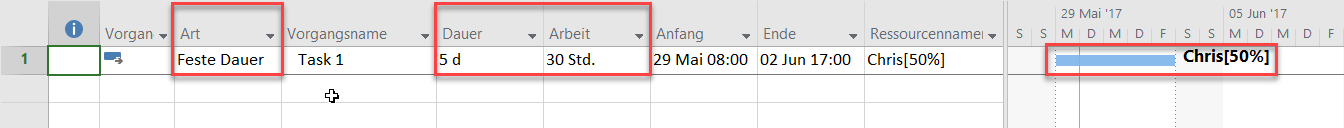 Wenn die Dauer eines Vorgangs vorgegeben ist und dann eine Ressource mit festem Einheitenwert zugewiesen wird, berechnet MS Project die Arbeit. Wird einem Vorgang mit einer Dauer von 5 Tagen eine Ressource zu 100% zugewiesen, ergibt sich ein Arbeitsvolumen in Höhe von 40 Stunden.