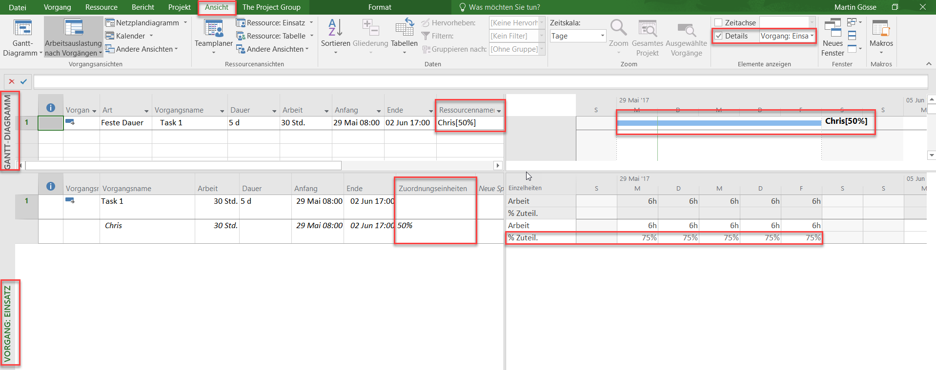 Sie sehen, dass MS Project in der Gantt Ansicht weiterhin 50% angezeigt. Auch die Zuordnungseinheiten im unteren linken Teil der Ansicht werden weiterhin mit 50% angegeben. Die Zuweisung auf den Vorgang selbst ist jedoch mit 75% erfolgt.