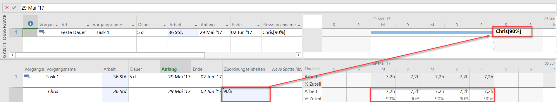 MS Project hat aber tatsächlich die prozentuale Zuweisung von Chris für diesen Vorgang neu berechnet.