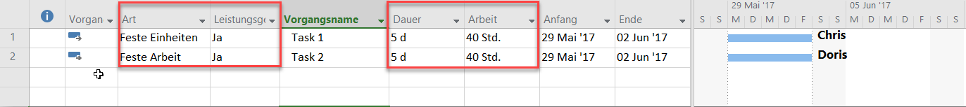 Die nachfolgende Abbildung zeigt die Ausgangssituation für die Vorgänge Task 1 und 2 (Zeile 1 und 2). Beide Vorgänge sind leistungsgesteuert und es gilt, jeweils ein Arbeitsvolumen in Höhe von 40 Stunden abzuarbeiten.
