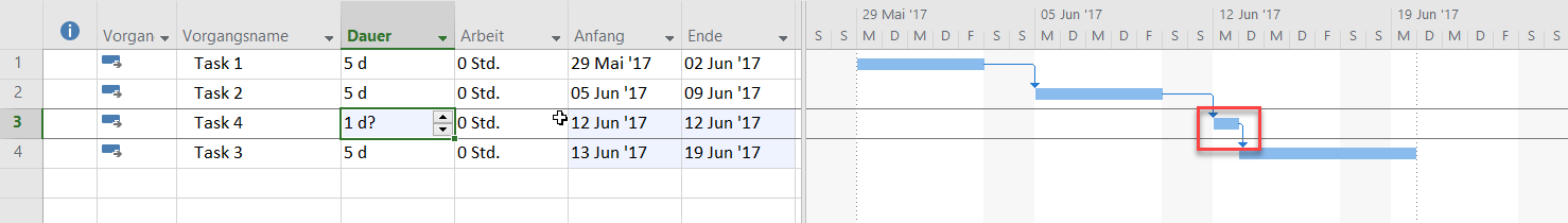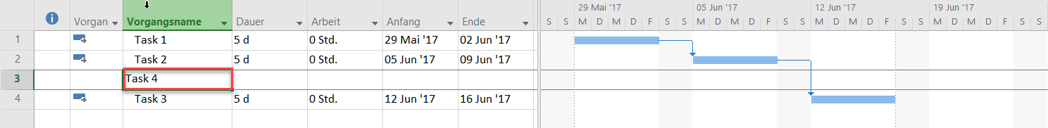 In der Ausgangssituation sind die Vorgänge Task 1, 2 und 3 (Zeile 1, 2 und 3) bereits miteinander verknüpft.