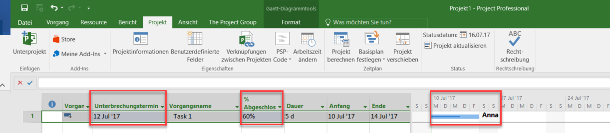 Sie erfassen also einen Fortschritt 60% im Feld % Abgeschlossen. In der Spalte Unterbrechungstermin, die ich zur Verdeutlichung eingeblendet habe, wird der 12. Juli 2017 als Unterbrechungsdatum angezeigt, da Anna am 10., 11. und 12. Juli gearbeitet hat.