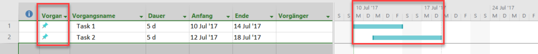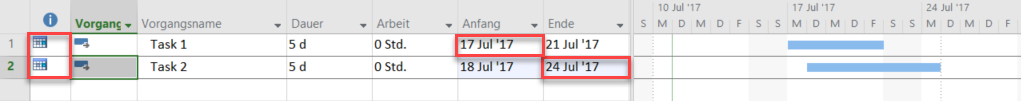 Im nachfolgenden Beispiel wurden 2 Vorgänge manuell geplant und deren von Anfangs- und Endtermine festgelegt.