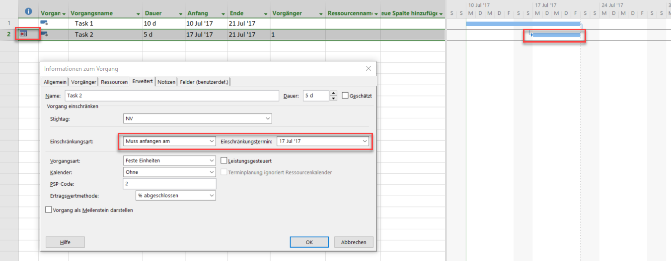 Ist diese Option Einschränkungstermine aktiviert, so wird die gesetzte Einschränkung immer beachtet. Für den Vorgang Task 2 (Zeile 2) habe ich über den Dialog Informationen zum Vorgang eine Vorgangseinschränkung Muss anfangen am gesetzt.