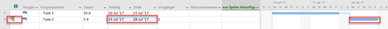 In der Informationsspalte erscheint das Kalendersymbol mit einem Warnsymbol, das Sie darauf aufmerksam macht, dass der berechnete Anfangstermin, 24. Juli, dem Einschränkungstermin für den Anfang, 17. Juli, widerspricht.